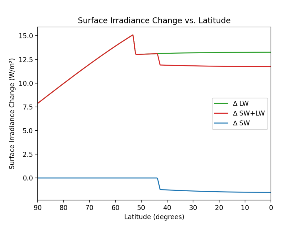 One problem with TICF, as I’ve outlined it, is that the surface irradiance forcing ∆Fₛ is assumed to be a constant that is independent of latitude.