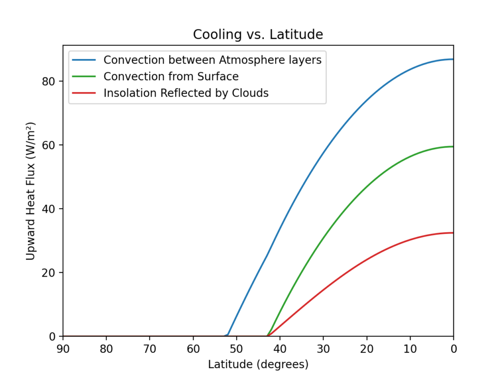 For latitudes below 52º, convection transports heat between the two layers of the atmosphere. For latitudes below 42º, surface convection transports heat into the atmosphere and forms clouds that reflect some of the incident shortwave radiation.
