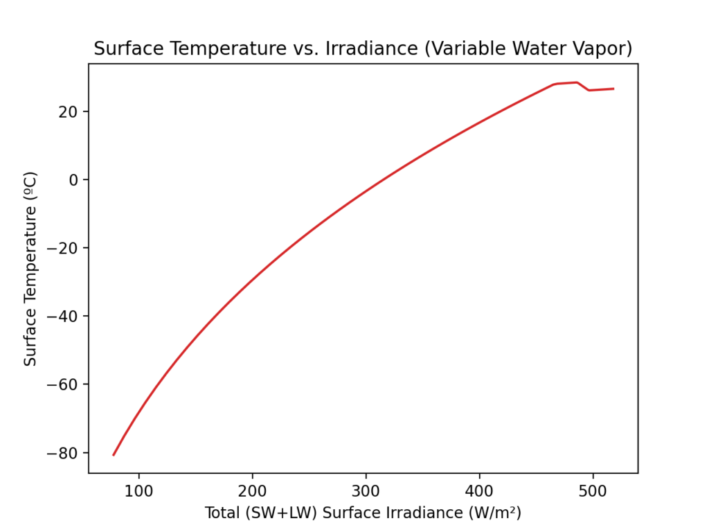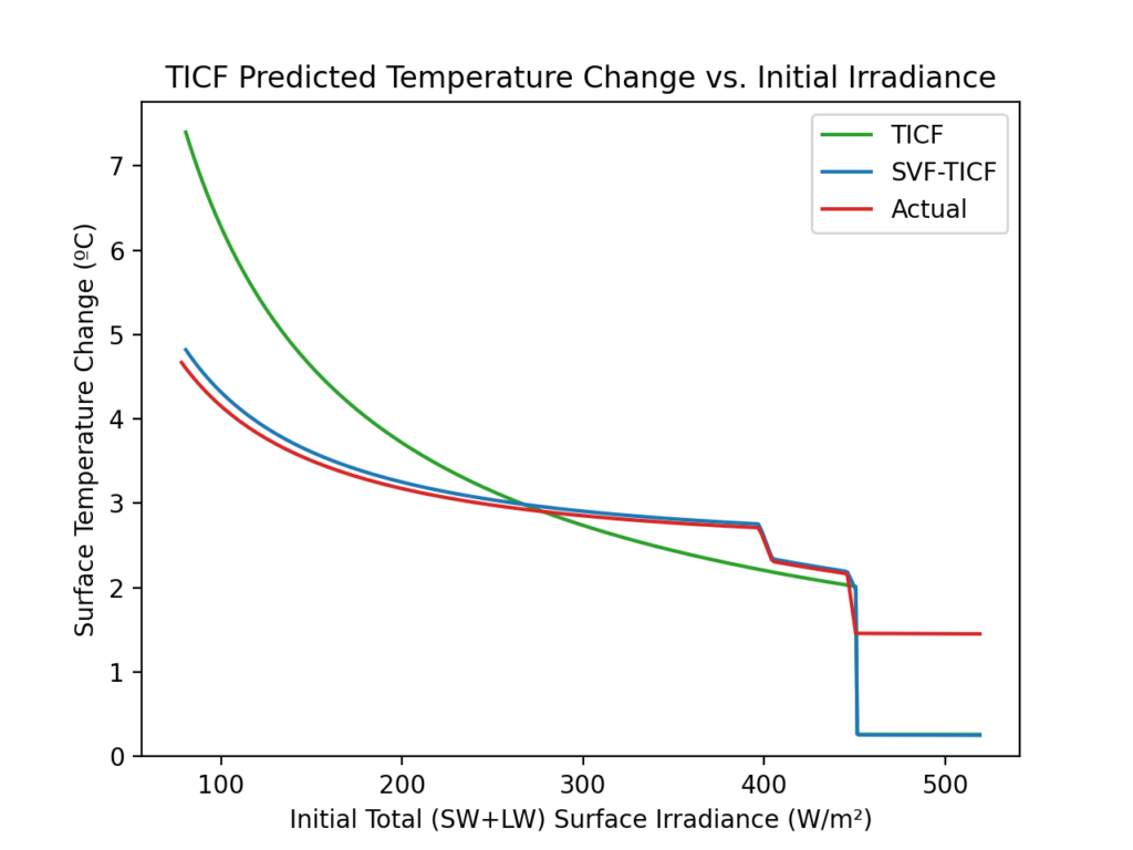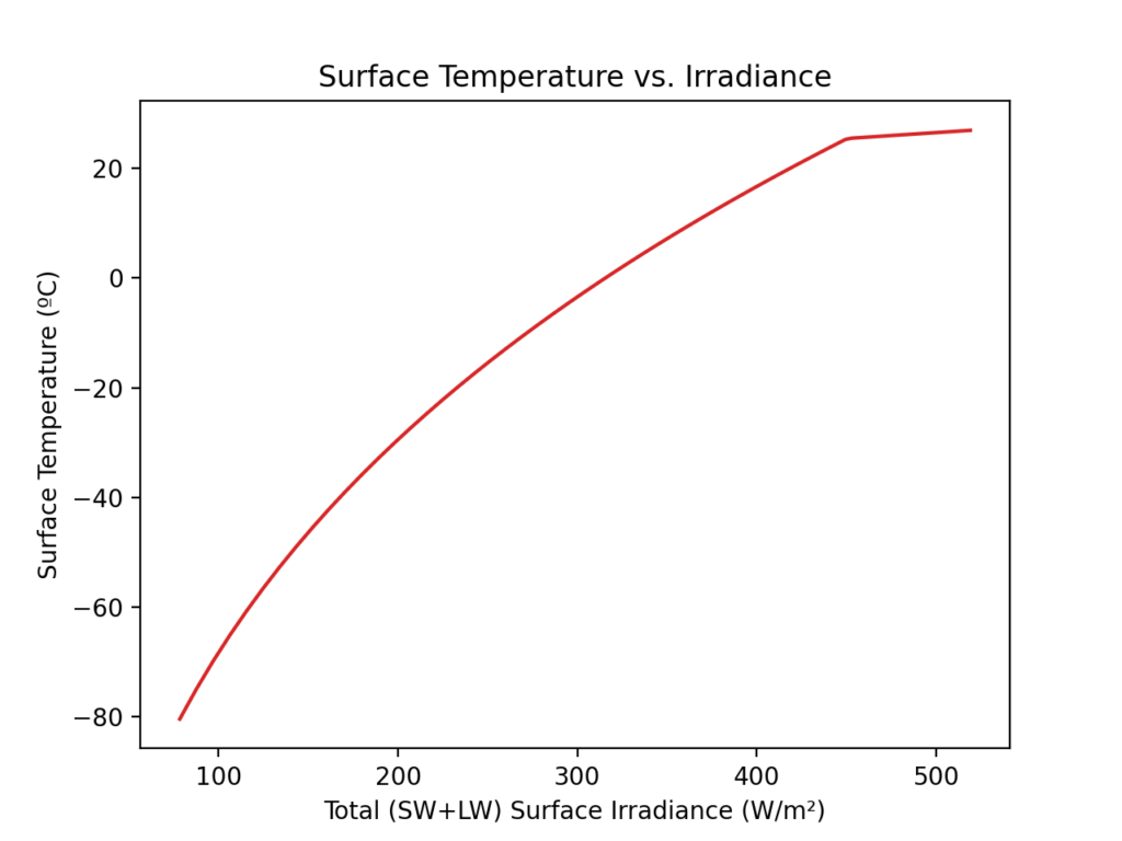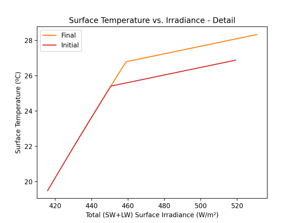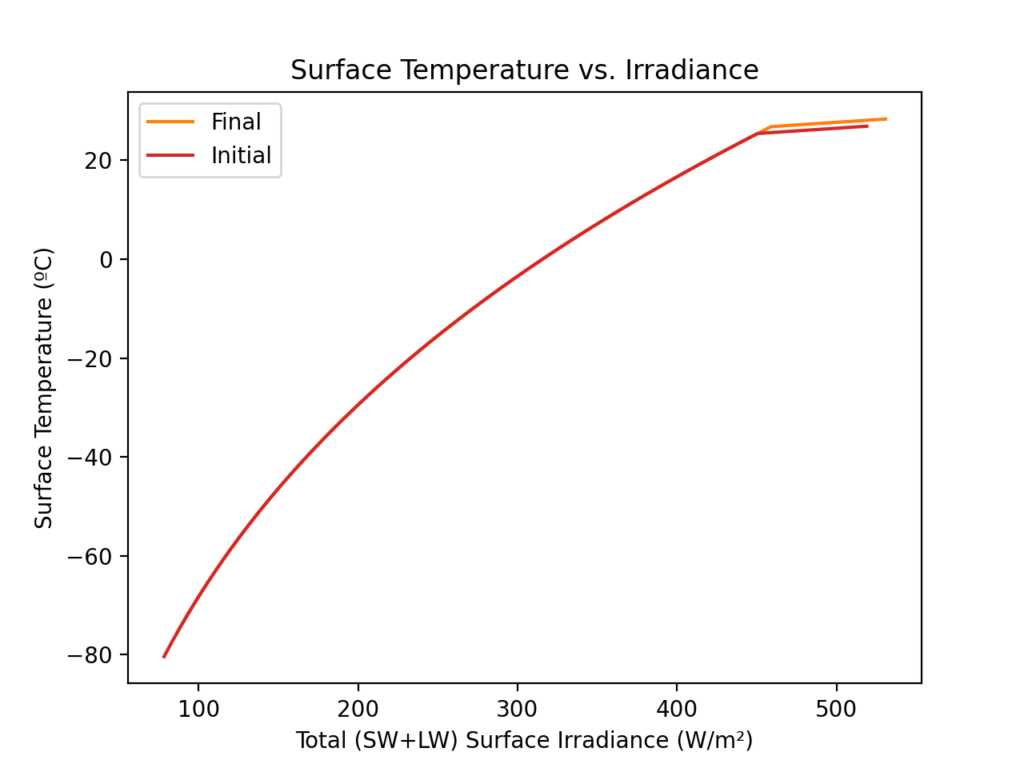 Once total surface irradiance exceeds 450 W/m², the “initial” and “final” curves are different. Unfortunately, this region of the graph applies to a majority of the surface area of the planet.