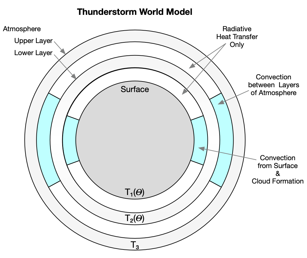 The Thunderstorm World (TW) model is designed to be as simple as possible while still accounting for convective heat transfer, cloud formation, radiant heat transfer, and variations in surface temperature.