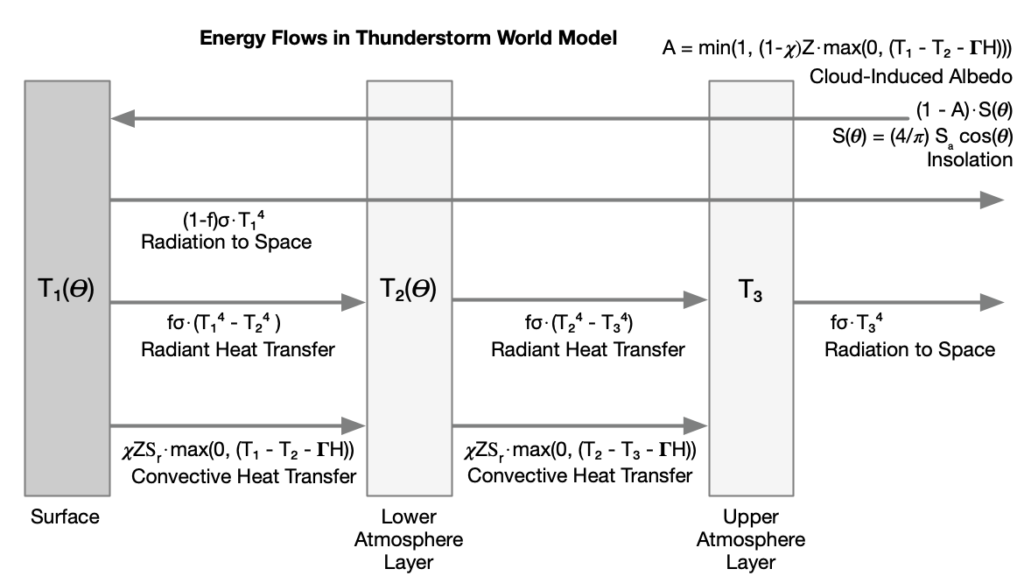 At a given latitude, 𝜽, the net energy flows within the Thunderstorm World (TW) model are as depicted in the following illustration.