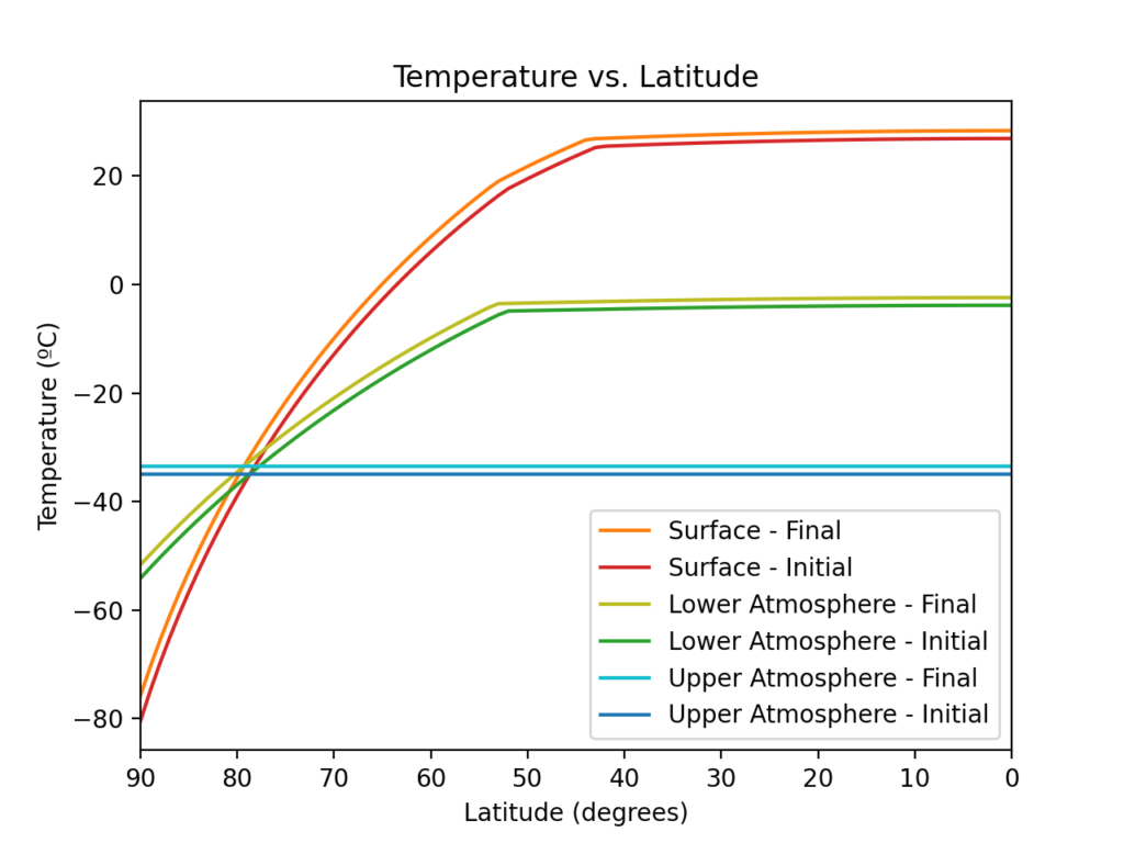 - Heat transfer between latitudes via atmospheric circulation is not fully modeled, but is addressed partially via the assumption that the temperature of the upper atmosphere is independent of latitude.