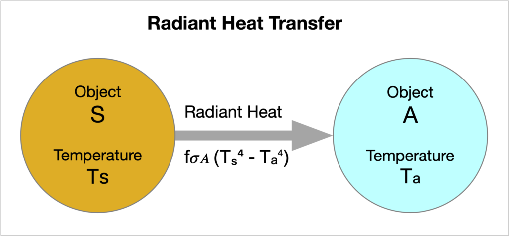 Radiant heat transfer has been well-understood for over a century. The rate at which this mechanism transfers heat from object S to object A is given by the radiant heat transfer rate formula: