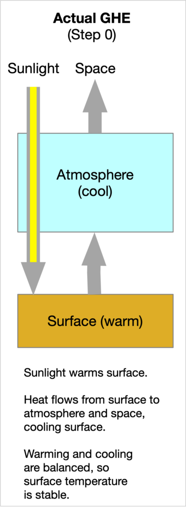 I think it’s helpful to think of that warming process as involving several steps. The first step—before increasing the concentration of “greenhouse gasses” (GHGs) in the atmosphere—is illustrated in the diagram below.