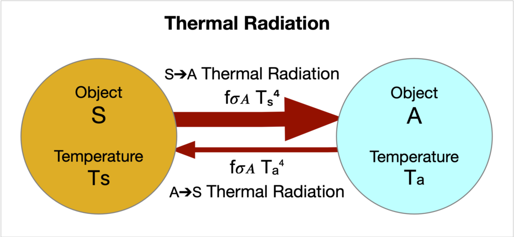 To illustrate the relationship between these concepts, let’s look at radiant heat transfer between two objects. This is depicted below, for object S at temperature Tₛ and object A at temperature Tₐ. The diagram assumes object S is warmer than object A, i.e., Tₛ > Tₐ.
