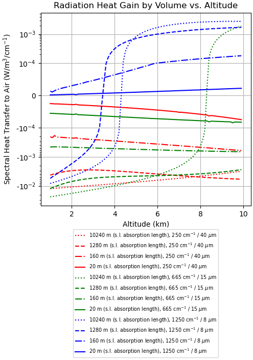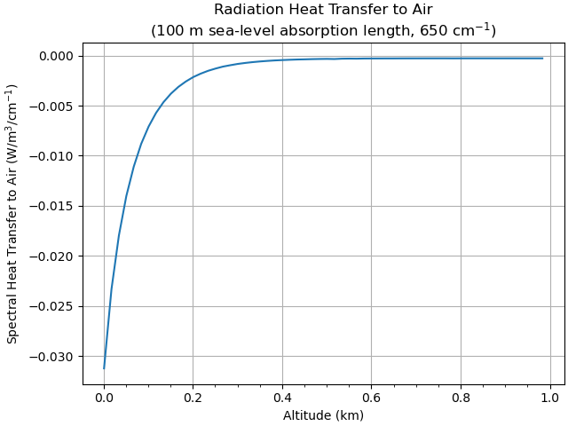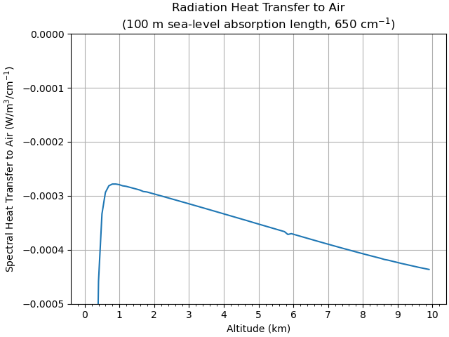 Note that in the scenario considered here (with air following the International Standard Atmosphere temperature profile), radiative heat transfer always has a net cooling effect on air at all altitudes.