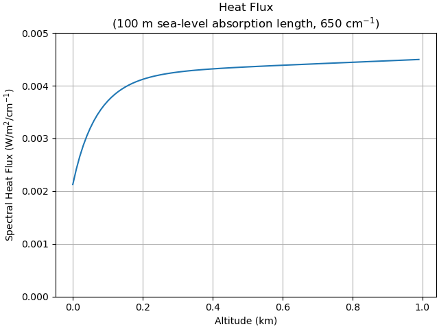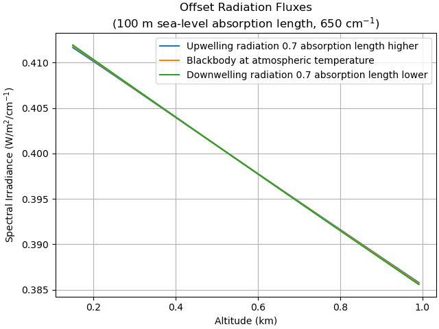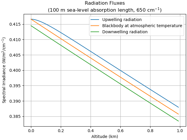 To verify this, in the figure below, I’ve plotted upwelling flux, downwelling flux, and blackbody emissions, for radiation with a frequency (wavenumber) of 650 cm-1, assuming a hypothetical gas with a sea-level absorption length of 100 m at that frequency.