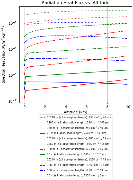 My plotted results in what follows relies on Analysis: Propagation of Thermal Radiation. The formulas rely on an assumption of “Local Thermal Equilibrium”, an assumption which is valid throughout the troposphere. I also assume that temperatures in the troposphere follow the profile in the International Standard Atmosphere. In addition, I initially assume that the absorption coefficient depends only on atmospheric density. Thus, I’m ignoring changes that occur as a result of changing spectral line collisional broadening. (I hope to remedy this limitation in later work.)