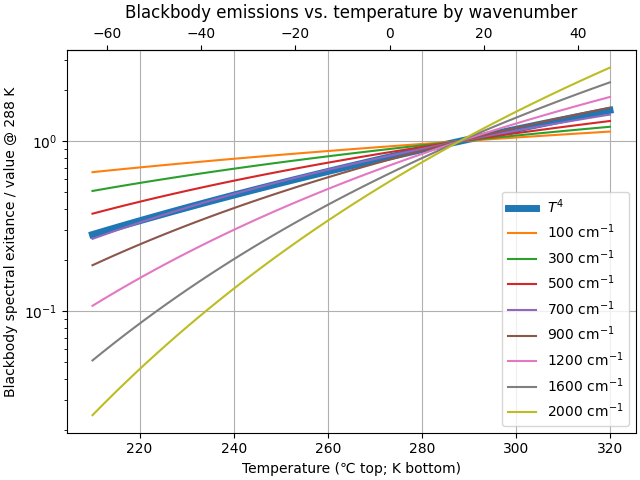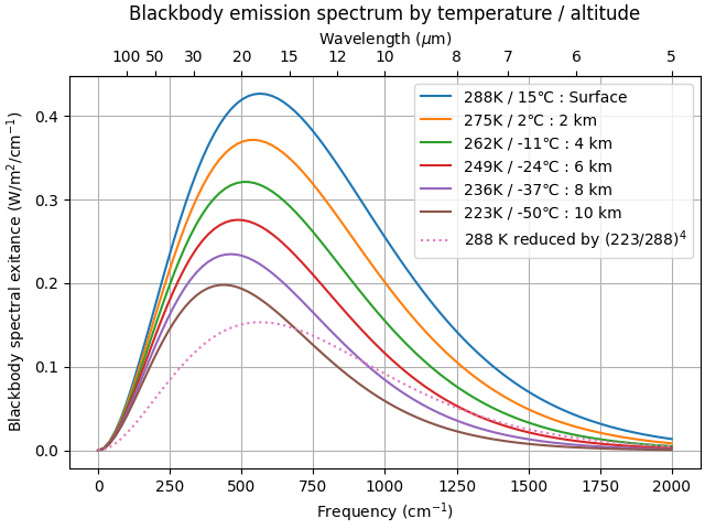 The following plot shows how the thermal emission spectrum varies with altitude / temperature, assuming the International Standard Atmosphere temperature profile.