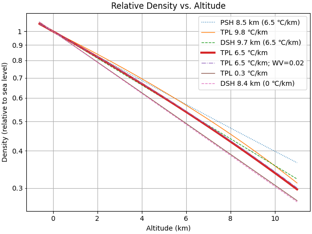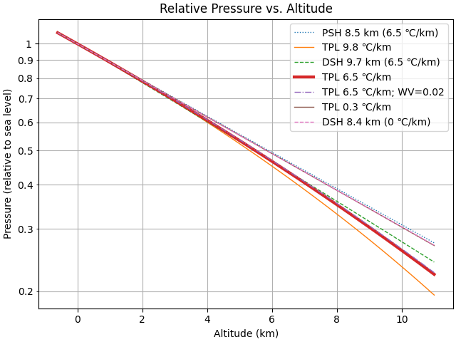 If a simpler model is needed, it appears that the Density Scale Height (DSH) model with a scale height of around 9.7 km offers a pretty good approximation to the TPL model for a 6.5℃/km lapse rate, particularly in the lower troposphere.