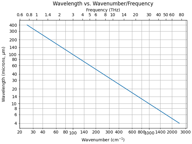 Note that “wavenumber” is just frequency divided by the speed of light. Sometimes I may write “frequency” but offer a wavenumber. Wavenumber might be considered to be an alternative unit for expressing frequency.